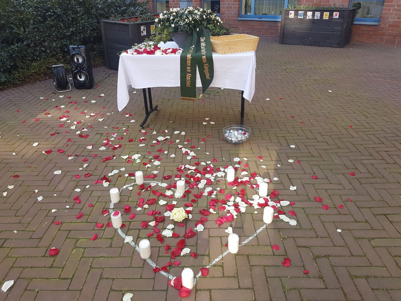 Rund 30 Mitarbeitende des Seniorenzentrums Zum Königshof haben sich am Mittwoch in Düsseldorf-Unterrath mit Masken und Abstand auf dem Platz vor der Einrichtung versammelt, um der Verstorbenen der vergangenen Wochen zu gedenken. Im Januar war ein Coronaausbruch festgestellt worden, in deren Verlauf sieben Bewohnerinnen und Bewohner am oder mit dem Virus verstarben. In der Gedenkfeier wurde ihrer sowie drei weiterer in diesen Wochen, unabhängig von Corona, verstorbenen Seniorinnen und Senioren gedacht.
