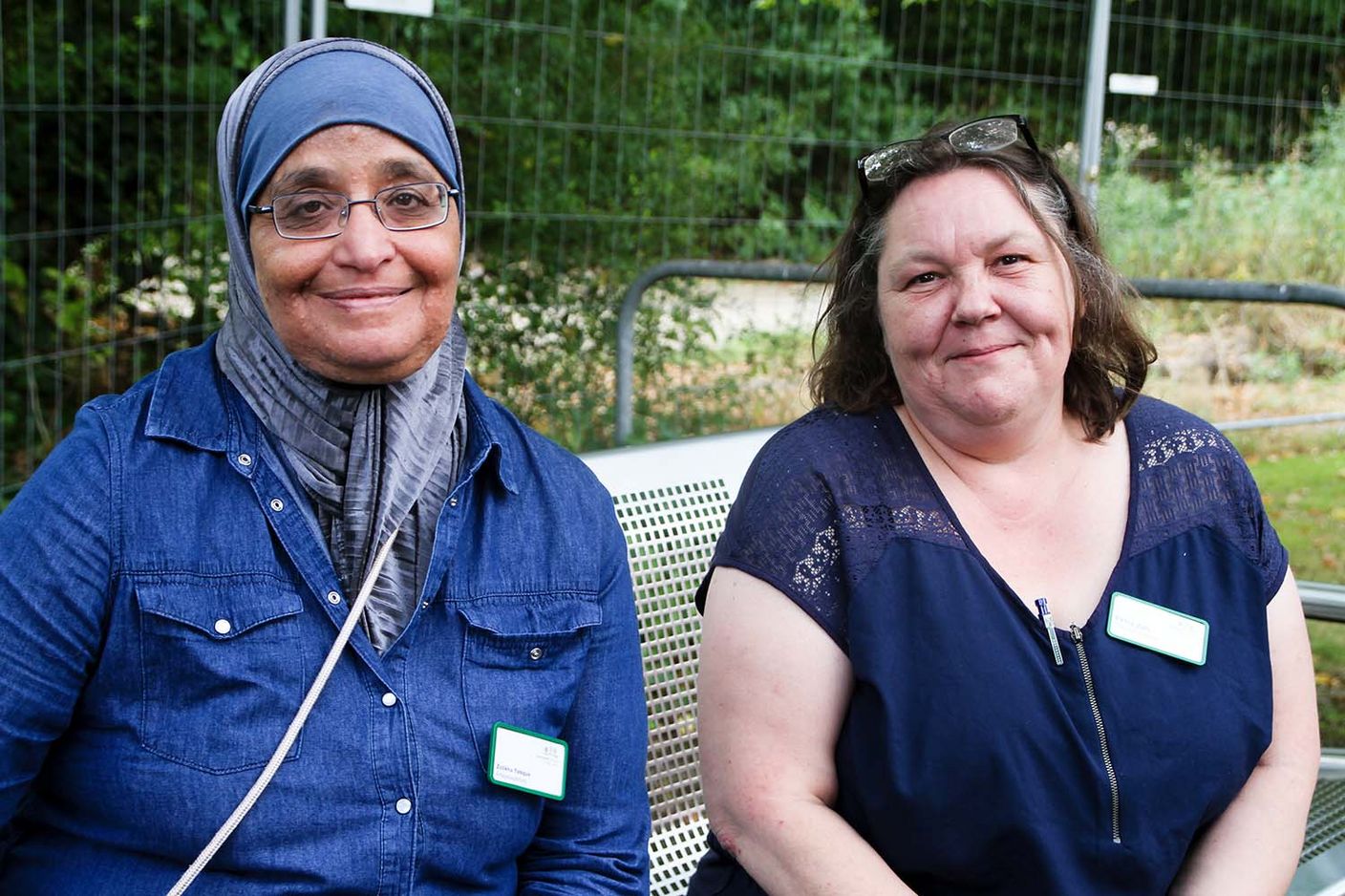 Zolikha Tebeque und Petra Zaß haben die neue Arbeitsweise längst verinnerlicht. Sie gehören zur mittlerweile dritten Gruppe von Mitarbeitenden aus dem Haus Ahorn, die seit November 2021 die rund einjährige berufsbegleitende Ausbildung zur Präsenzkraft durchläuft. »Ich wurde gefragt und habe sofort Ja gesagt«, berichtet Petra Zaß, die seit 33 Jahren im Haus Ahorn als Pflegeassistentin tätig ist. »Weil ich wusste, dass man in der Ausbildung sehr viel lernt«, nennt sie den Grund für ihr großes Interesse. Zolikha Tebeque, seit 2012 Alltagsbegleiterin der Menschen mit schwerer Demenz, sieht das genauso – und freut sich ebenfalls: »Wir lernen für die Arbeit, aber auch für uns privat«, sagt sie.