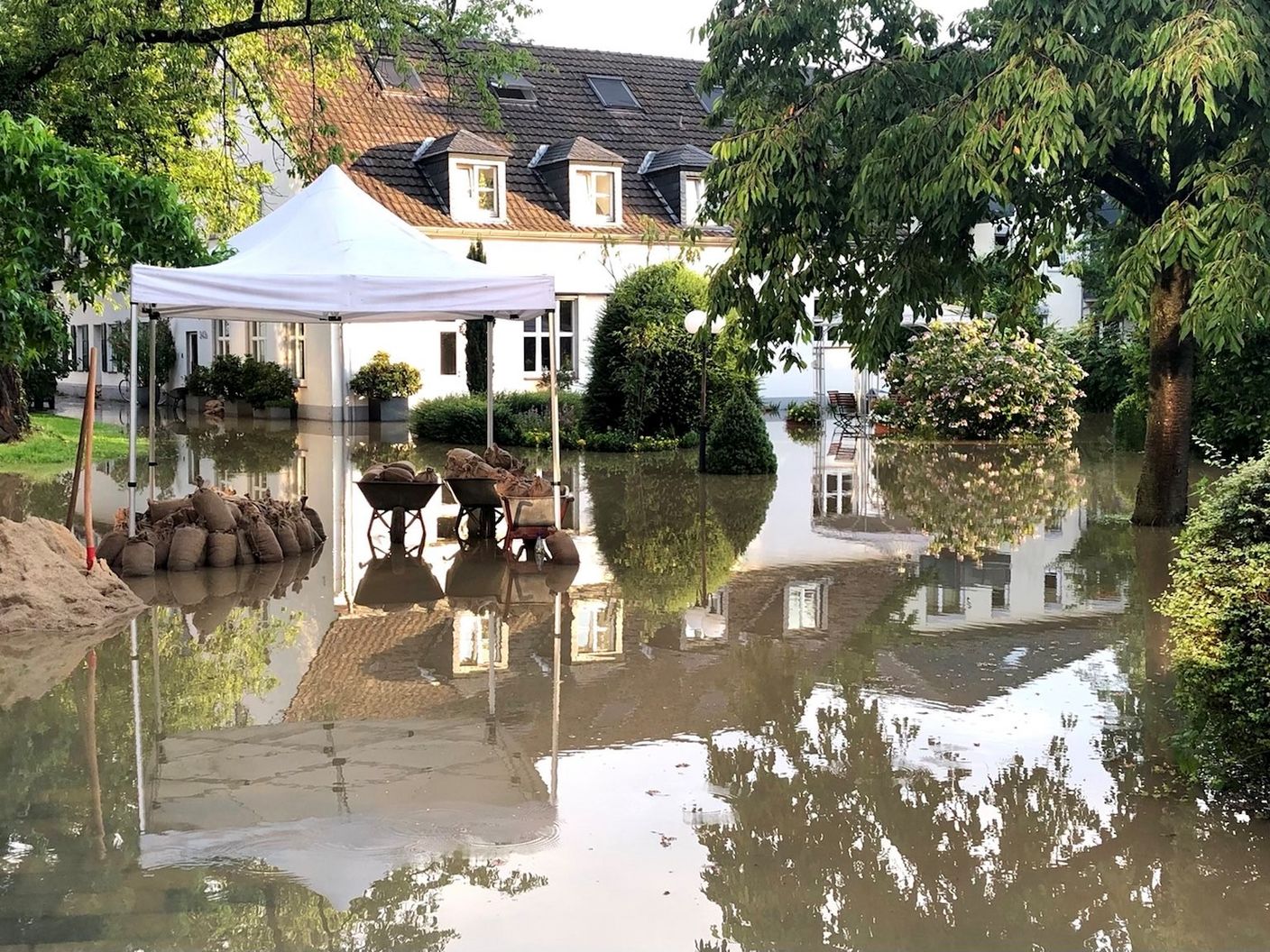 Während die meisten Bewohnerinnen und Bewohner der dort ansässigen Graf Recke Wohnen & Pflege und Graf Recke Sozialpsychiatrie & Heilpädagogik schliefen, waren die Mitarbeitenden zusammen mit Feuerwehr, DLRG und weiteren Hilfswerken bereits seit Stunden dabei, Vorkehrungen zu treffen und abzusichern, was abzusichern war. So auch Mitarbeiterin Christine Noglik vom Service-Wohnen Düsselthal. »Es lief alles so schnell voll. Es war unfassbar. Wir standen bis zu den Knien im Wasser. An einigen Stellen sogar bis an die Oberschenkel.« Gemeinsam mit ihrem Kollegen Kay Wiesner und ihrem Ehemann war sie die ganze Nacht im Einsatz. »Mit jeder Welle kamen 20 bis 30 Zentimeter Wasser auf einen Schwung«, berichtet der Ehemann von Christine Noglik, der wie viele andere unermüdlich mithalf, die Lage unter Kontrolle zu bringen. Schutzmaßnahmen und Vorkehrungen waren bereits am 14. Juli getroffen worden, mit einer Katastrophe dieses Ausmaßes hatte jedoch niemand gerechnet.