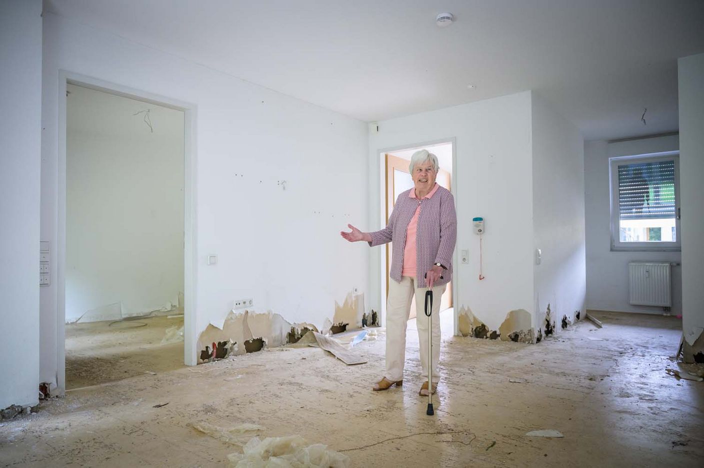 Alle Bewohner sind nach der Evakuierung der Häuser in einer städtischen Notunterkunft, bei Angehörigen und in stationären Pflegeeinrichtungen der Graf Recke Stiftung untergekommen. Zwei Tage nach der Hochwasserkatastrophe kehrte Charlotte Wilts mit ihrem Sohn zurück auf das überflutete Gelände und in ihre geliebte Wohnung. »Dann habe ich erst mal einen Schock gekriegt. Alles im Eimer, alles!«, erzählt Wilts. Wie bei vielen kam der Schock erst Tage später beim Anblick der Verwüstung. Nur ihrem Sekretär mit ihren wichtigen Dokumenten darin sei glücklicherweise nichts passiert. »Der hat so richtig dicke Strempel als Füße!« Fast alles muss sie jetzt neu kaufen. Auf qualitativ hochwertige und teure Möbel, wie sie sie vor dem Hochwasser hatte, werde sie dann verzichten müssen, und auch auf einen Teppichboden. »Ich werde lernen, mit dem Wischmopp umzugehen«, sagt die 91-Jährige. »Das können wir aber auch machen«, erwidert ihre 19-jährige Enkelin Laura, die ihrer Oma beim Ausräumen der Wohnung geholfen hat. »Ich habe tolle Kinder und Enkelkinder«, freut sich Charlotte Wilts.