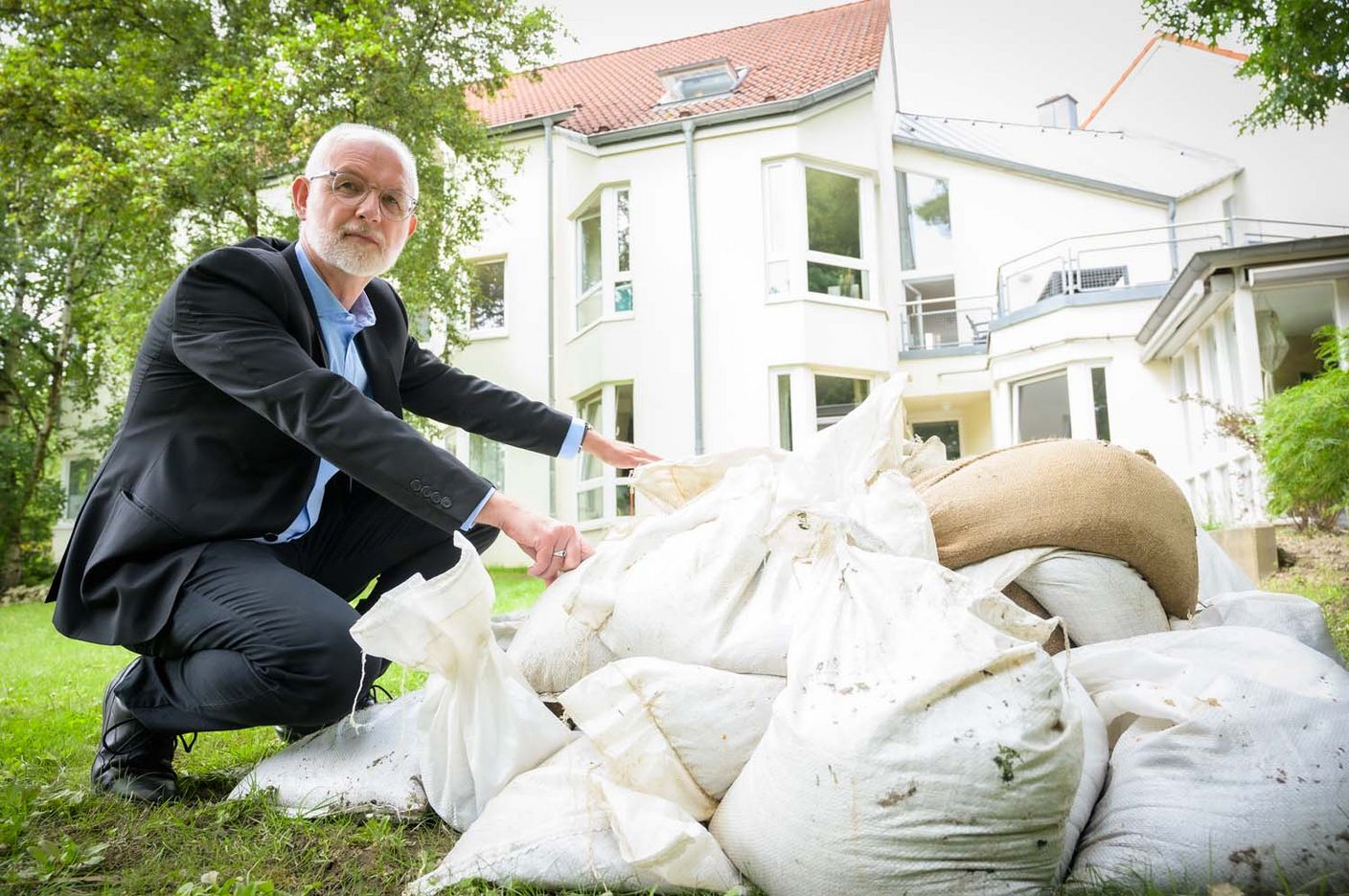 Auch für Reimund Weidinger wird die Nacht zum 15. Juli in Düsseldorf-Grafenberg unvergessen bleiben. Er leitet die Graf Recke Sozialpsychiatrie & Heilpädagogik. Auf dem Flutgelände befindet sich nicht nur seine Verwaltung, zudem sind dort auch Wohnhäuser für Menschen mit psychischen Erkrankungen, ein arbeitstherapeutisches Spielwarengeschäft, eine Gärtnerei, eine Küche, ein Seminarraum und Werkstätten der Arbeitstherapie. Am Tag vor der Flut startete er zur Absicherung der Gebäude eine Sandsackaktion. Sand wie Säcke wurden von Firmen und dem THW geliefert und von den Mitarbeitenden befüllt. »In relativ kurzer Zeit! Wir haben die Sandsäcke an neuralgische Punkte wie Kellerabgänge gebracht. Am frühen Abend dachten wir sogar, dass wir mit der Vorsorge vielleicht übertrieben hätten«, berichtet Weidinger. Er bestellte bei der DLRG sogar ein richtiges Boot, obwohl die Lage zu dem Zeitpunkt stabil schien. »Als das Boot angeliefert wurde, haben manche gesagt: ›Weidinger, du bist bekloppt!‹«