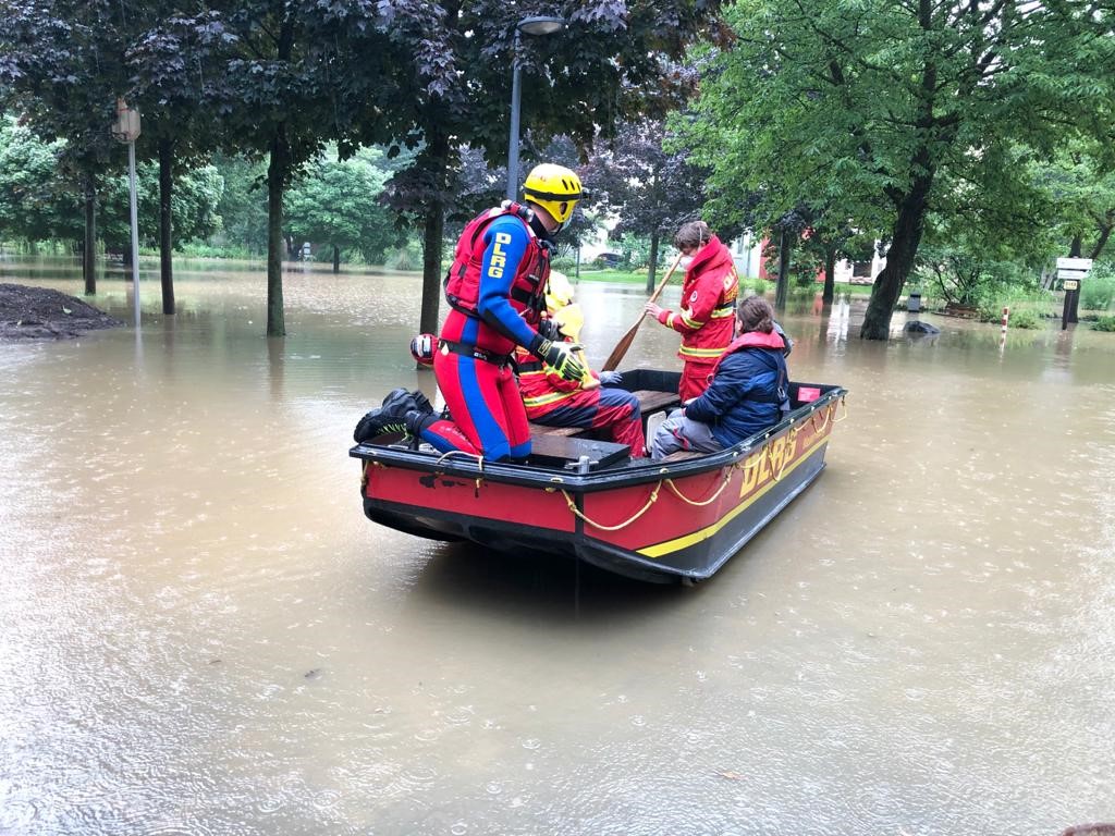 Wie sein Kollege Joachim Köhn von der Graf Recke Wohnen & Pflege wurde auch Reimund Weidinger, zur beginnenden Nacht kaum zu Hause angekommen, wieder nach Grafenberg zurückgerufen. Das Wasser war sehr stark angestiegen. Zusammen mit seinen beiden Mitarbeitenden Thorsten Banna und Jan Dubbel hat er die Vor- Ort-Hilfe koordiniert. »Das Haus an der Düssel war komplett von Wasser umgeben. Wir konnten es nur noch mit dem Boot erreichen«, sagt Reimund Weidinger, froh über seine Vorahnung. Es sah zwischenzeitlich so aus, als müsste das Wohnhaus mit 25 Bewohnerinnen und Bewohnern evakuiert werden. Das war am Ende nicht nötig. Für die Bewohner gab es keine Gefahr, sie waren mit allem versorgt. Das Boot kam ein weiteres Mal bei der Evakuierung der Seniorenwohnungen zum Einsatz. »Das stabile Boot war für die älteren Menschen richtig gut«, so Reimund Weidinger.