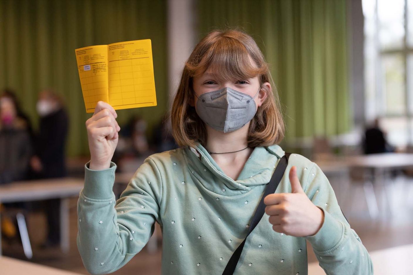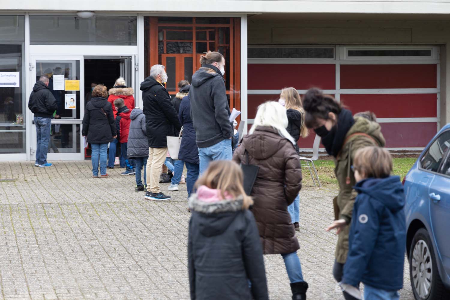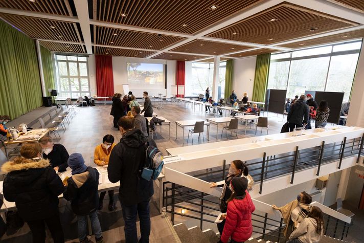 Worin Finn seine Mission in der entferntesten Ecke der Aula sieht, ist völlig klar: Der große wollknäulige Hund von Michael Mertens lässt sich gerade ausgiebig von Emma streicheln. Die hat sich heute impfen lassen, weil sie Angst hatte, ihre Oma anzustecken. Mutter Sabine Brosch ist dankbar, dass die Möglichkeit für ihre Tochter nun besteht. "Die Gefahr der Ansteckung hat eben Auswirkungen auf alle Lebensbereiche, ob Schule, Arbeit oder Familie."