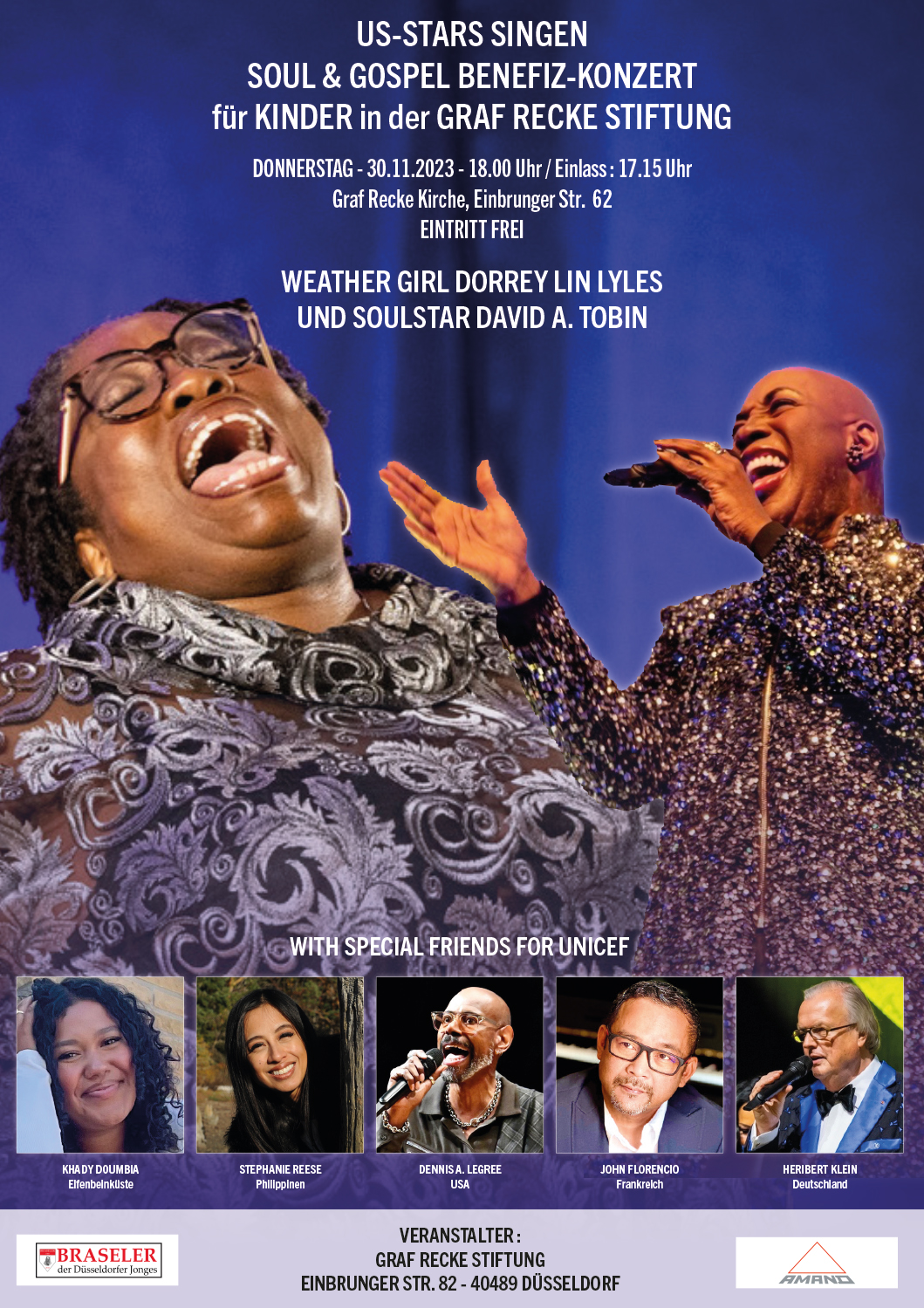 Für das Gospel- und Soulkonzert am 30. November in der Graf Recke Kirche in Düsseldorf-Wittlaer konnte die Graf Recke Stiftung Heribert Klein, Unicef-Komitee Deutschland, als Kooperationspartner und Moderator gewinnen: „Mein Herz schlägt seit mehr als 40 Jahren für Kinder. Ich freue mich, auch die Graf Recke Stiftung unterstützen zu können und lade herzlich alle Düsseldorfer ein, dieses besondere Konzert zu erleben.“ Heribert Klein konnte für das Benefizkonzert engagierte internationale Künstlerinnen und Künstler wie Dorrey Lin Lyles von den Weather Girls und Soulstar David A. Tobin gewinnen.
