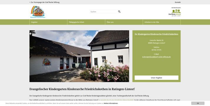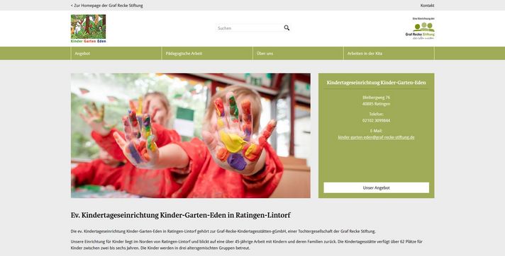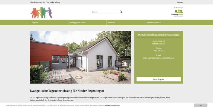 Im Laufe der letzten Wochen sind die Seiten der Evangelischen Tageseinrichtung für Kinder Regenbogen in Angermund, des Evangelischen Kindergartens Kinderarche Friedrichskothen in Ratingen-Lintorf und der Evangelischen Kindertageseinrichtung Kinder-Garten-Eden in Ratingen-Lintorf online gegangen. In Abstimmung der jeweiligen Leiterinnen und Leiter der Einrichtungen, der Kita-Fachberatung und der Kommunikation der Graf Recke Stiftung wurden neue Texte erstellt und Fotos gemacht. Zuvor hatten sich alle in einem gemeinsamen Workshop Gedanken zur Struktur aller Seiten gemacht. Auf dieser Grundlage werden in den kommenden Monaten die Seiten der weiteren Kitas entstehen und online gehen.