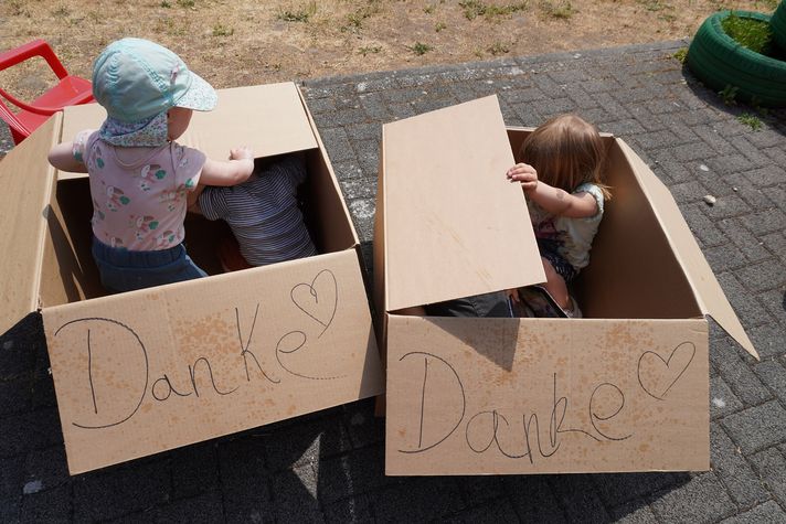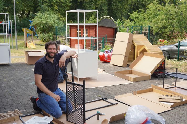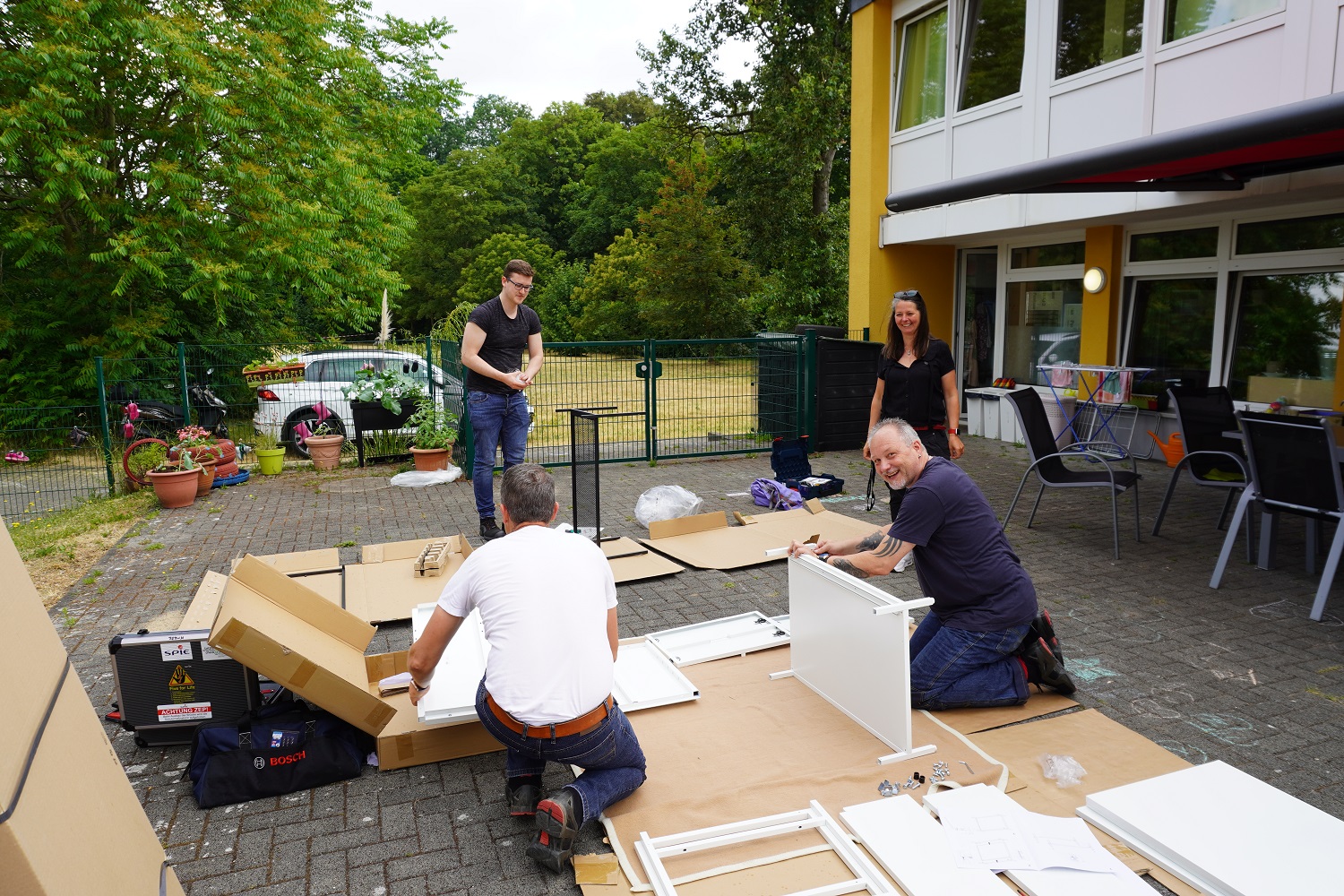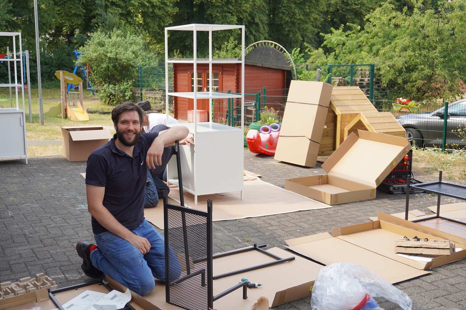 Das Team hatte dafür sein eigenes Werkzeug mitgebracht und ging gleich gut organisiert ans Werk. Trotz der sommerlichen Temperaturen waren sich Sebastian Dahms und Thomas Kratz einig: „Uns macht das heute einfach Spaß: Hier sieht man direkt, was wir alles geschafft haben!“ Die kleinen Kinder schauten sich die Arbeit der SPIE-Mitarbeitenden erst einmal vorsichtig durchs Fenster an, bis sie sich an der Hand von Betreuenden und Eltern etwas näher heranwagten und am Ende begeistert in die leeren Kartons zum Spielen hüpften.
