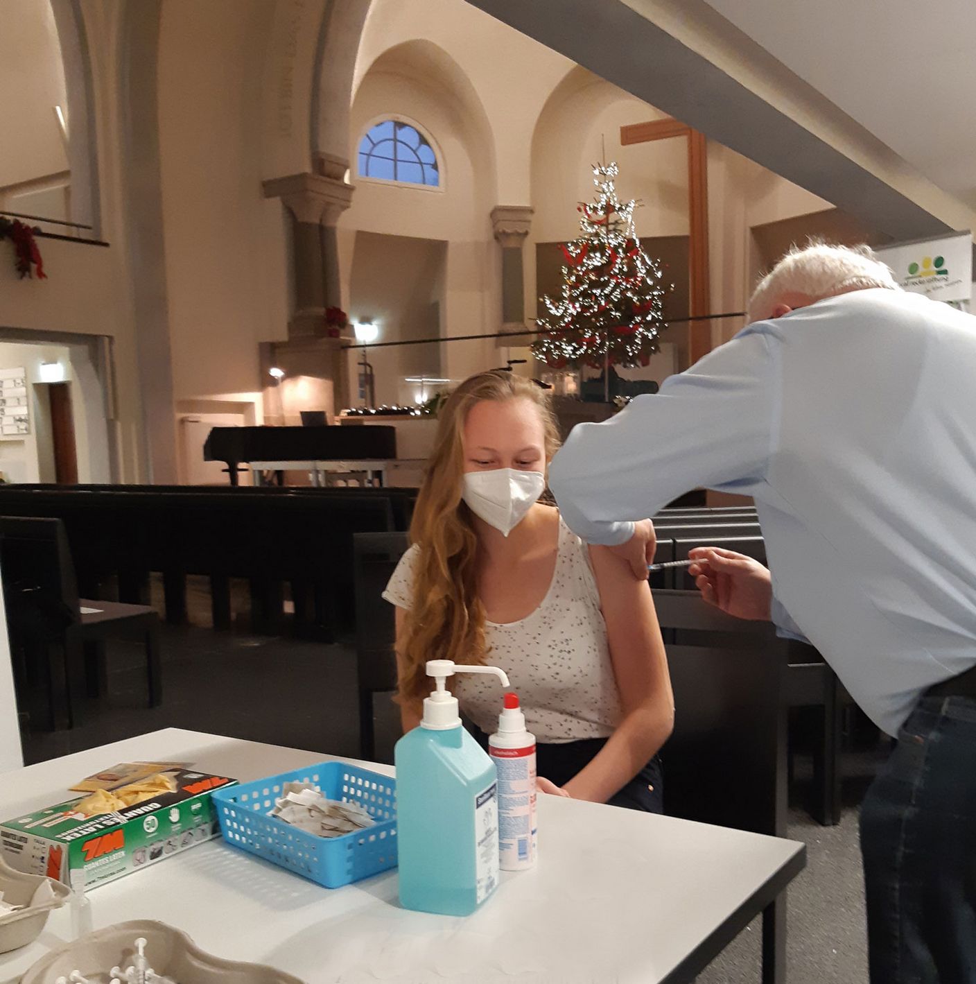 Am vierten Adventswochenende gab es eine weitere Einladung der Graf Recke Stiftung zur Erst-, Zweit- und Drittimpfung, dieses Mal in der Graf Recke Kirche in Düsseldorf-Wittlaer. 70 Menschen ließen sich dort von einem der Kirche verbundenen Hausarzt sowie dem Leiter der Graf Recke Wohnen & Pflege, Joachim Köhn, impfen. Jugendliche aus der Graf Recke Erziehung & Bildung, Mitarbeitende aus der Graf Recke Stiftung sowie Menschen aus der Nachbarschaft und Gemeinde nahmen das Angebot an. „Die Nachfrage nach den Terminen war groß“, berichtet Stiftungspfarrer Dietmar Redeker, der die Aktion mit initiierte. „In der Wartezeit nach der Impfung konnten sich die Besucher mit Weihnachtsgebäck, Kinderpunsch und Kaffee in der weihnachtlich geschmückten Kirche stärken.“ Für diese Aktion habe es viele positive Rückmeldungen und großen Dank gegeben.