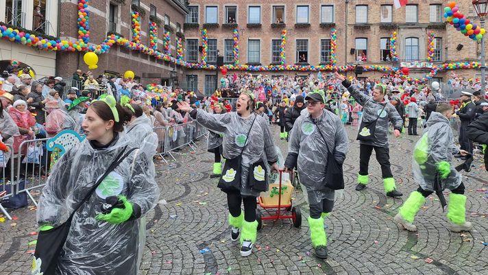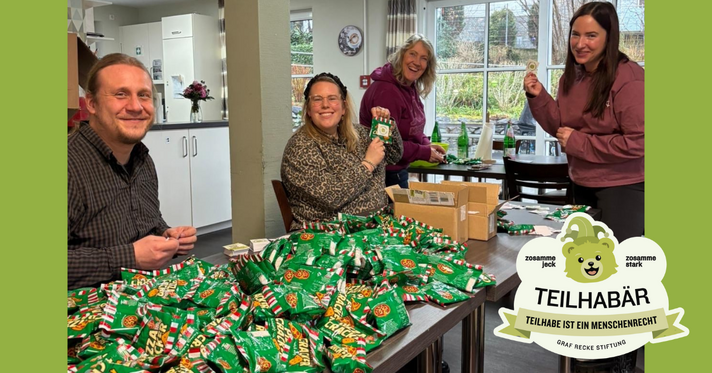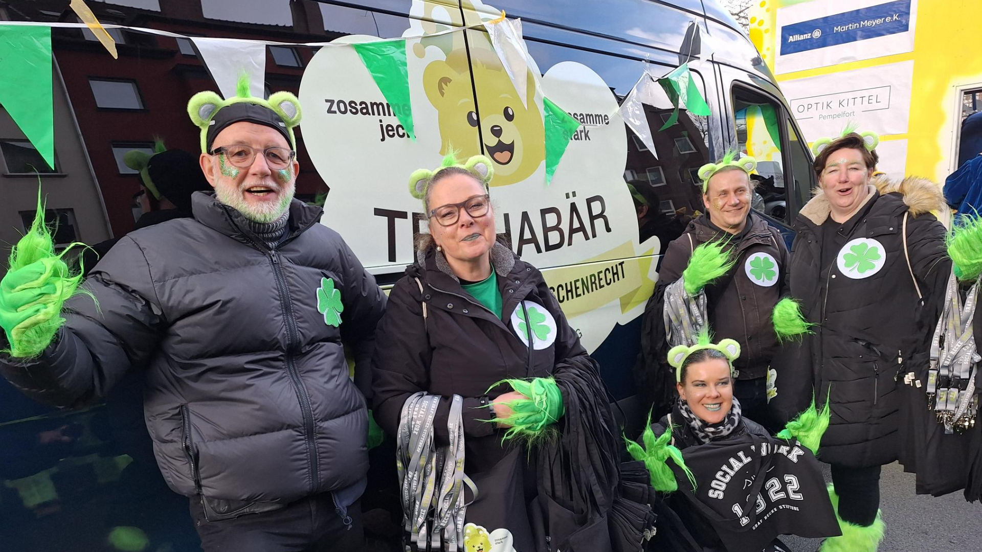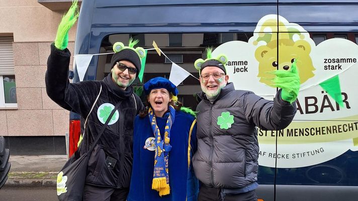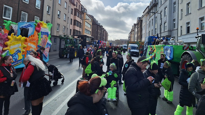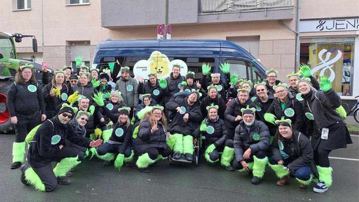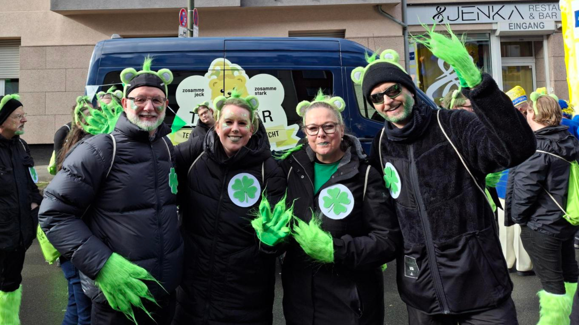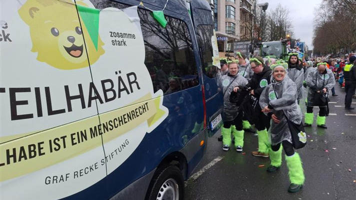 Unter dem Motto „Zosamme jeck, zosamme stark – Teilhabe ist ein Menschenrecht!“ waren 35 Leistungsberechtigte und Mitarbeitende der Graf Recke Stiftung als Fußgruppe im Düsseldorfer Rosenmontagszug dabei. Die Teilhabären setzten damit ihren grünleuchtenden Tatzenabdruck unter das diesjährige Motto: „Mer bliewe bunt – ejal wat kütt!“