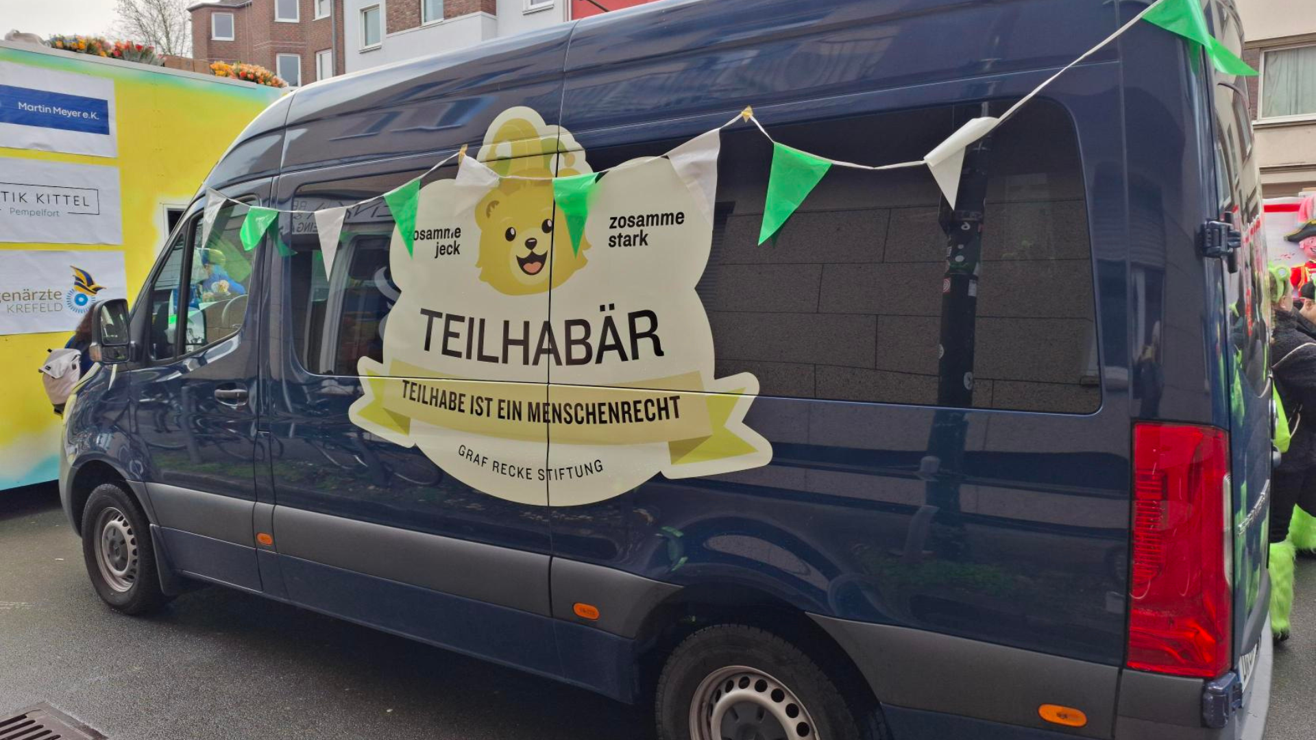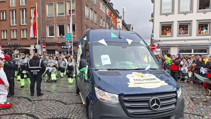 „Teilhabe ist ein Menschenrecht.“ So stand es auf dem Begleitfahrzeug der Teilhabären im ersten Drittel des Zugs. Teilhabe bedeutet dazugehören, mitmachen und mitgestalten. Nicht für alle Menschen ist das selbstverständlich, wenn sie durch eine Behinderung, eine psychische Erkrankung, im Alter oder aus anderen Gründen nicht oder nur eingeschränkt an der Gesellschaft teilhaben können. Deshalb auch die Idee, erläuterte Annette Methfessel noch am Rosenmontagsmorgen im Radiointerview mit Antenne Düsseldorf: „Wir haben gemeinsam mit der Unternehmenskommunikation und Bewohnerinnen und Bewohnern überlegt: Was können wir machen, um unseren Grundgedanken, dass soziale Teilhabe ein Menschenrecht ist, symbolisch darzustellen?“ Die Teilhabären in Grün sind die gemeinsame Antwort darauf. Einen besonderen Dank richtete sie an Bürgermeister Josef Hinkel, „der das mit seinem sozialen Engagement überhaupt erst möglich gemacht hat.“